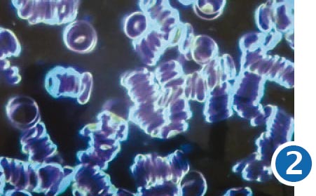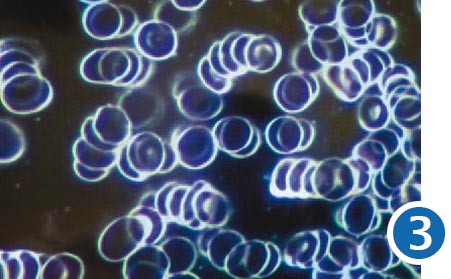 Versuch 2 – Den Probanden wurde Blut abgenommen, nachdem sie ca. 3 Minuten mit einem Mobiltelefon ohne RayChip telefoniert hatten. Das Blutbild zeigte eine deutliche Veränderung: Die Erythrozyten (rote Blutkörperchen) hatten sich zu sogenannten Geldrollen zusammengezogen und verklebt. Dadurch war ein normaler Blutfluss nicht mehr gewährleistet.
