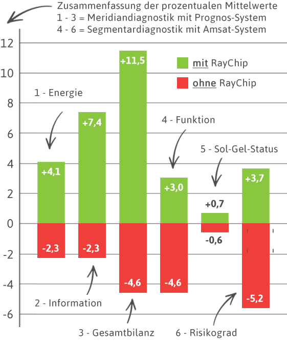 Die untersuchten RayChip bewirken eine Verbesserung der energiemedizinischen Kriterien «Energie, Funktionsstatus und Sol-Gel-Zustand». Die Ergebnisse sind statistisch signifikant bis hoch signifikant.
