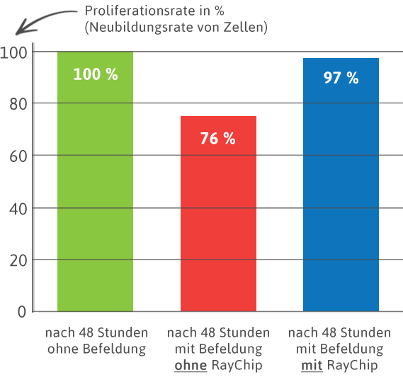 Bei den bestrahlten Zellen ohne RayChip zeigte sich nach 48 Stunden eine statistisch signifikante Verminderung der Zellgesamtzahl gegenüber den nicht bestrahlten Kontrollkulturen. Bei den unter gleichzeitiger Verwendung des RayChip bestrahlten Zellen zeigte sich hingegen auch nach 48 Stunden kein signifikanter Unterschied im Vergleich zu den Kontrollkulturen. Der RayChip annulliert somit nachweislich die Auswirkungen elektromagnetischer Bestrahlung auf die Zellproliferation.